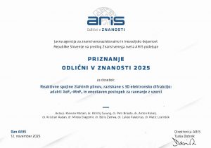 Our colleague from K5, Asst. Prof. Dr. Mirela Dragomir, is a co-author of the paper “Reactive Noble-Gas Compounds Explored by 3D Electron Diffraction: XeF2–MnF4 Adducts and a Facile Sample Handling Procedure, ACS Central Science, 2024, 10, 1733–1742”, which has been awarded the Excellent in Science 2025, Slovenian Research and Innovation Agency, Ljubljana, Slovenia.